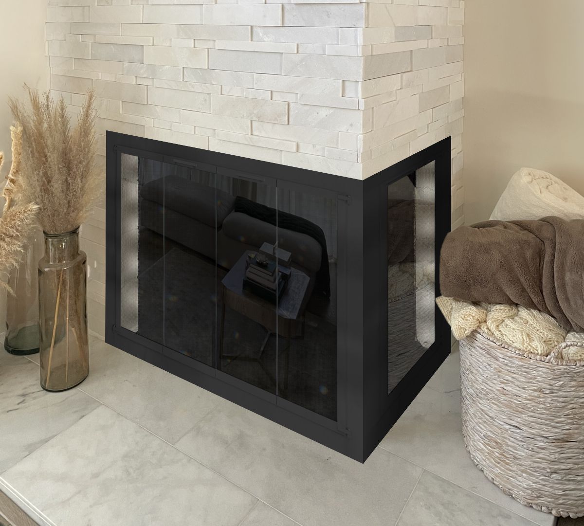 If you are planning on burning anything in your fireplace, you need to have mesh behind the glass so you can burn a fire with the doors open. You can chooe between gate mesh backup doors and sliding mesh curtains. Functionally, gate mesh performs the best as the wire has smaller holes that sparks cannot get through. Aesthetically, mesh curtains may be preferred because they do not have a vertical center frame that obstructs the view of the fire. When you are not using the fire or you want a complete unobstructed view, they do not stick out like gate mesh doors when they are opened.