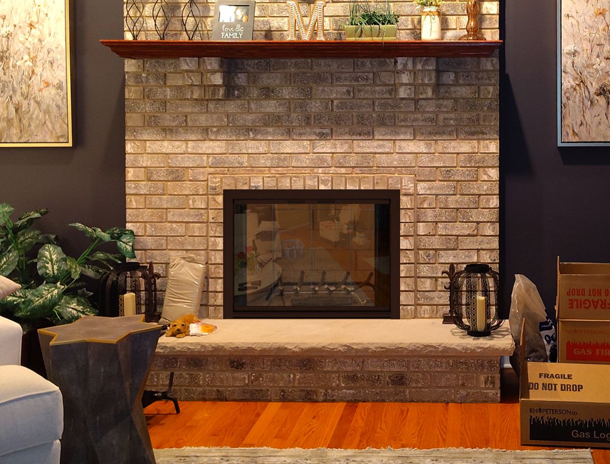 Customer Comments: Hello I found your website from Google. I am setting up a g45-24 burner and vented logs but I need a new door because the old door that was clamped on had a 3 inch+ lip with no vent on the bottom. As you can see we have some custom. Brick work that I was hoping to show off rather than cover up like it was before with that old black door, over overlapped this brickwork completely. We want to make sure the new door matches the decor nicely and also has good venting on the bottom since there is already a slight lip on the bottom.