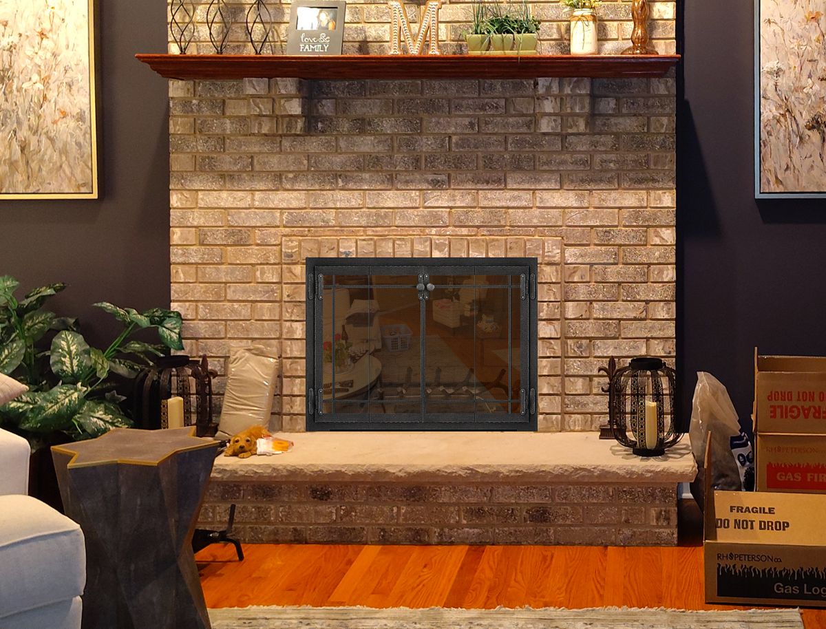 Option #3: Design Specialties Carolina Fireplace Glass Door in Classic Bronze with Clear Glass and Mesh Curtains.