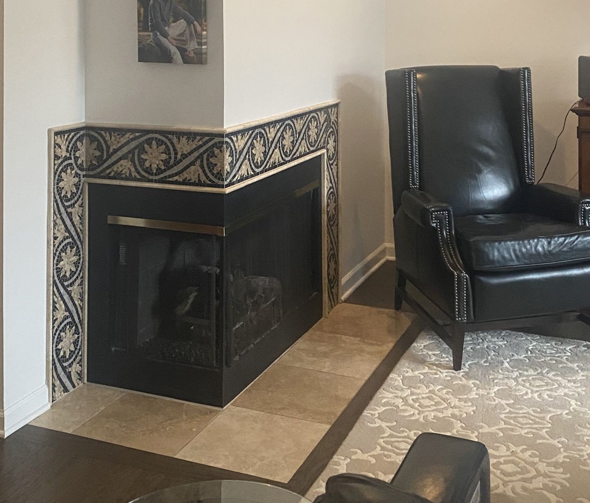 Our Comments: Before I dive in to specific recommendations, I need to know how you plan on treating the fireplace once you remove the existing tile. Below are two examples to illustrate how important determining how the new facing will impact the doors that I recommend.