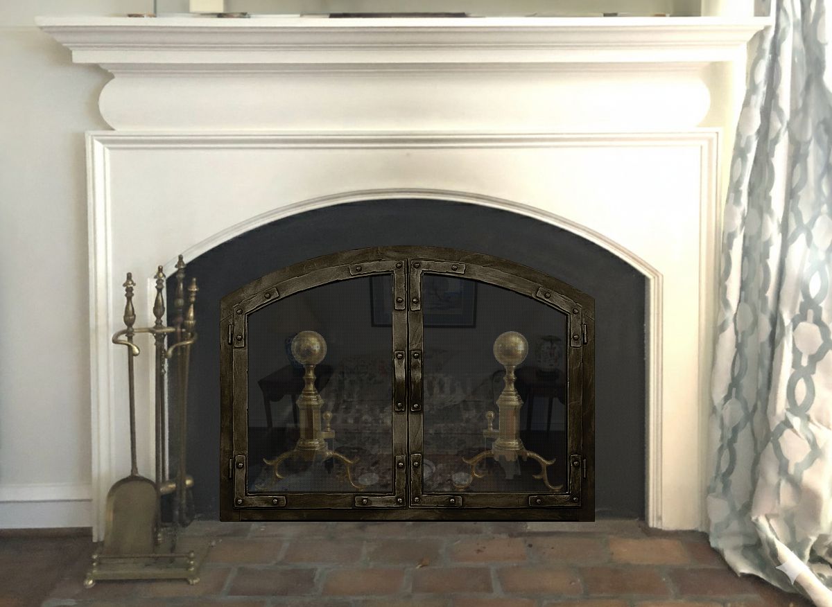 Option #7: Hand Crafted Craftsman Wrought Iron Arch Fully Framed Gasket Sealed Bifold Fireplace Door in Distressed Medium Bronze with Tempered or Ceramic Glass and Heavy Duty Gate Mesh Backup Doors.