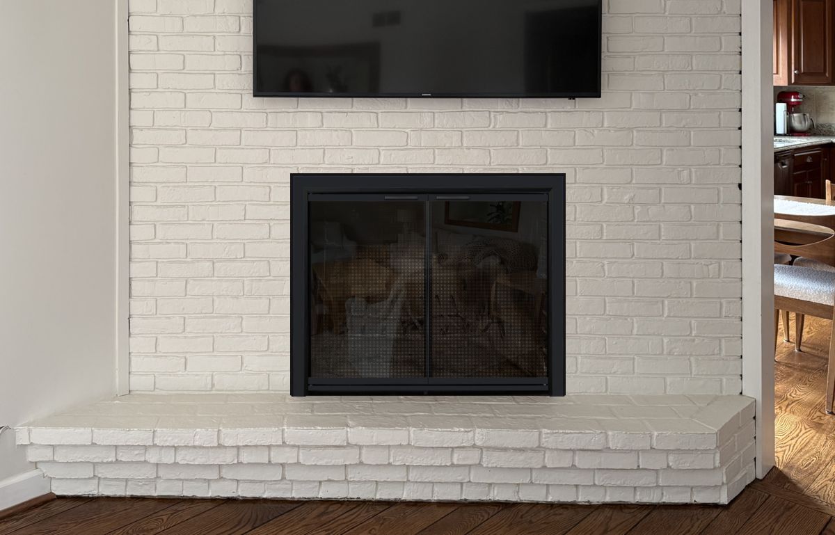 Option #2: PW Breckenridge Aluminum Fullview Cabinet Fireplace Door in Black with Tempered or Ceramic Glass and Mesh Curtains.