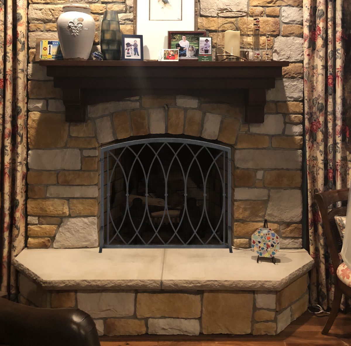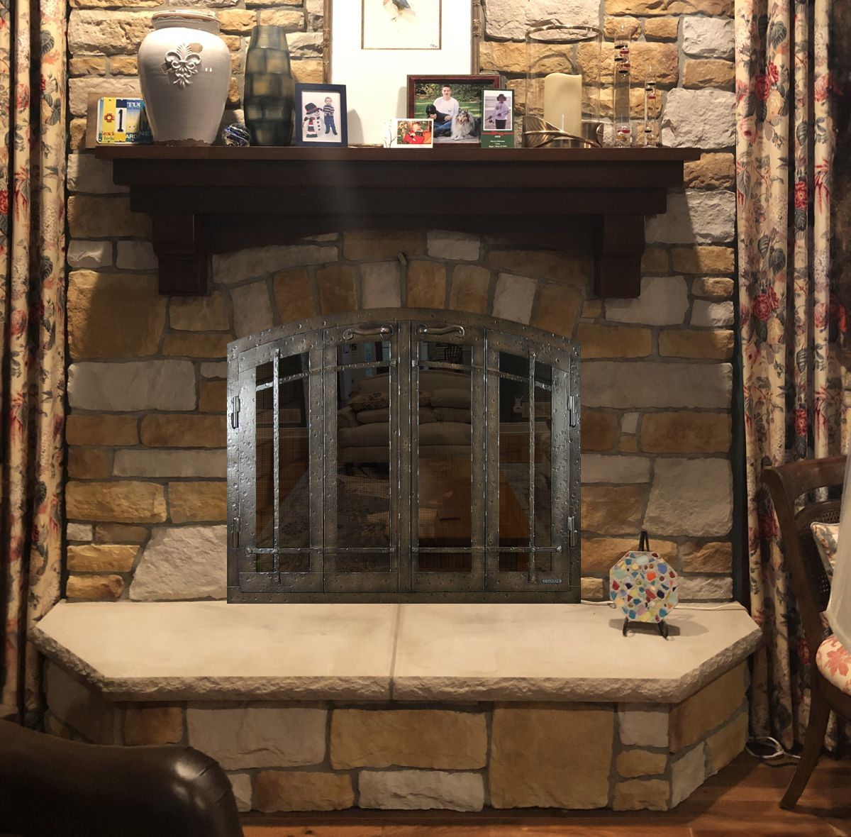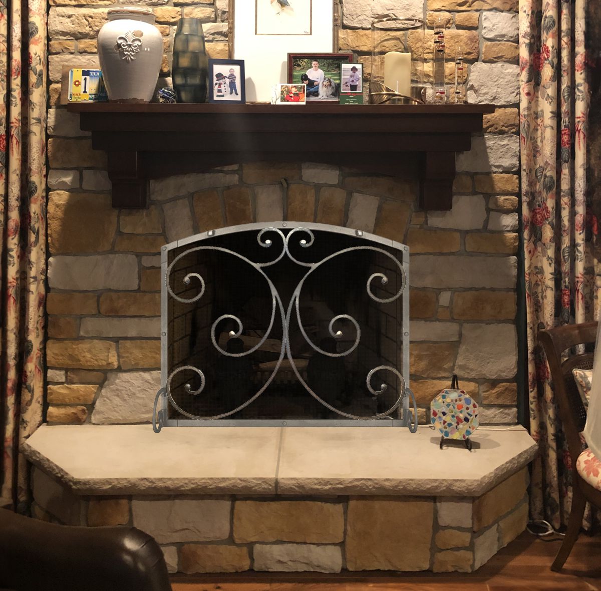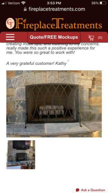 Customer Comments: Good morning. I have more of a fancy design taste (See Example). I do not want a screen that hides the stone irregularities and edges. I also do not want a 3 sided screen either. I also am not looking for any glass. Any suggestions are welcomed. We never use this fireplace because of the furniture placement, but it is a focal point in the room and I want something that looks special. If you think we need glass doors to accomplish this look, that is fine too. I think that the fireplace is 42 wide and 32 high