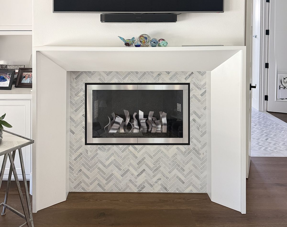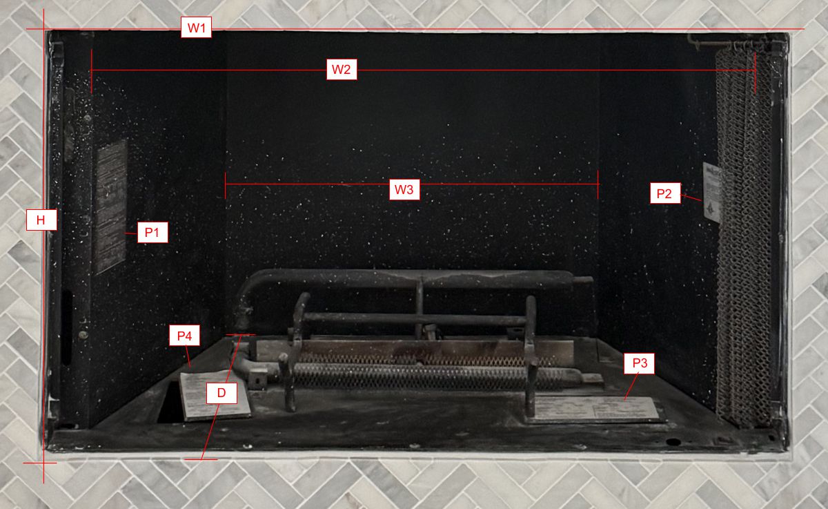 Important Note: After creating these mockups, I realized this appears to be a "Gas Only" fireplace, not a wood burning unit. All of the gas fire options presented below require a wood burning fireplace. If this is in fact a gas only fireplace, you must only replace the logs with the ones that came with the fireplace and none of the gas burning options below will work. Please provide the details in the measuring instructions below.