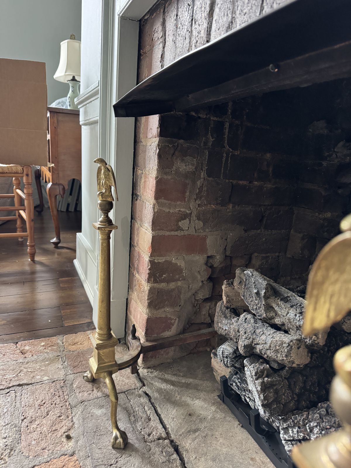 Our Comments: I would suggest moving the andirons in where the shanks are against the logs, which is a more proper position. We can then make a screen that has cutouts for the shanks, which is more of a period design. I am showing options made both ways so you can decide which way you like best.
