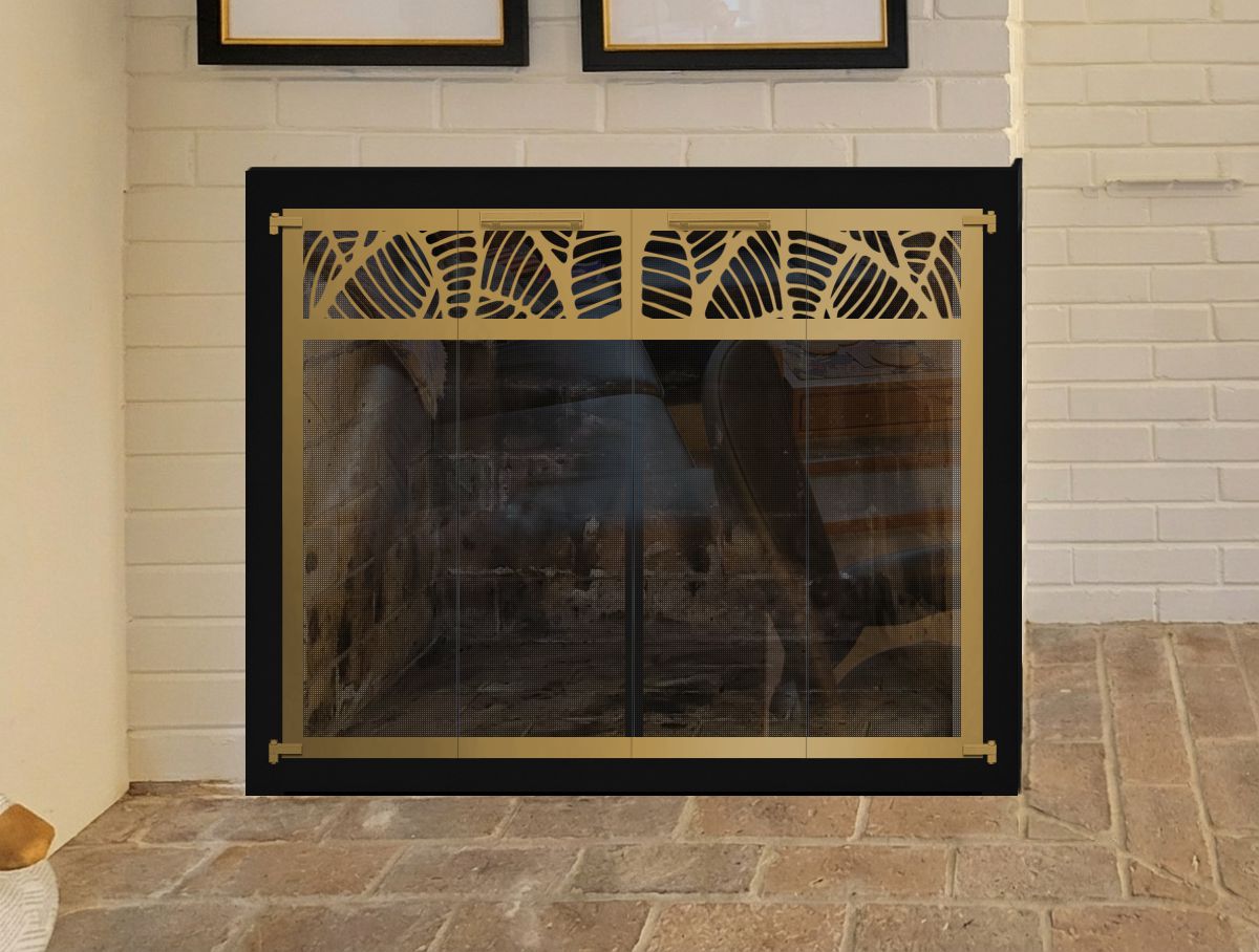 Option #2: Hearth Creations Laser Cut Steel Corner Fireplace Bifold Door with Window Pane Design in Matte Black with Satin Gold Doors and Gate Mesh Backup Doors. Tempered or Ceramic Glass.