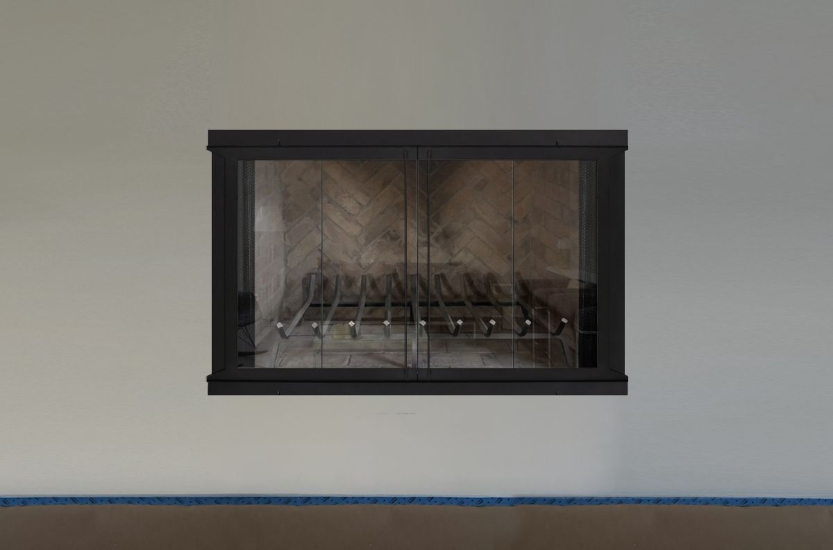 Option #1: PW Creekside Aluminum Bifold Fireplace Door in Black with Tempered or Ceramic Glass and Mesh Curtains.