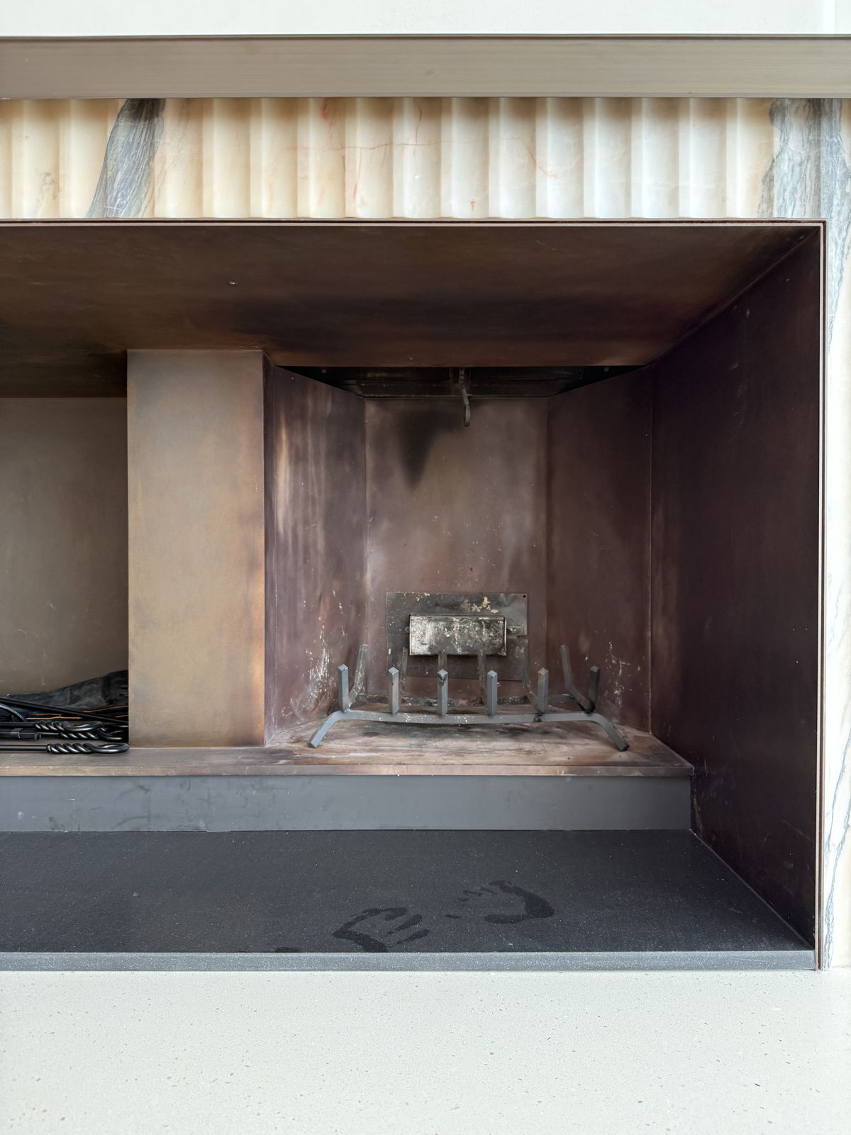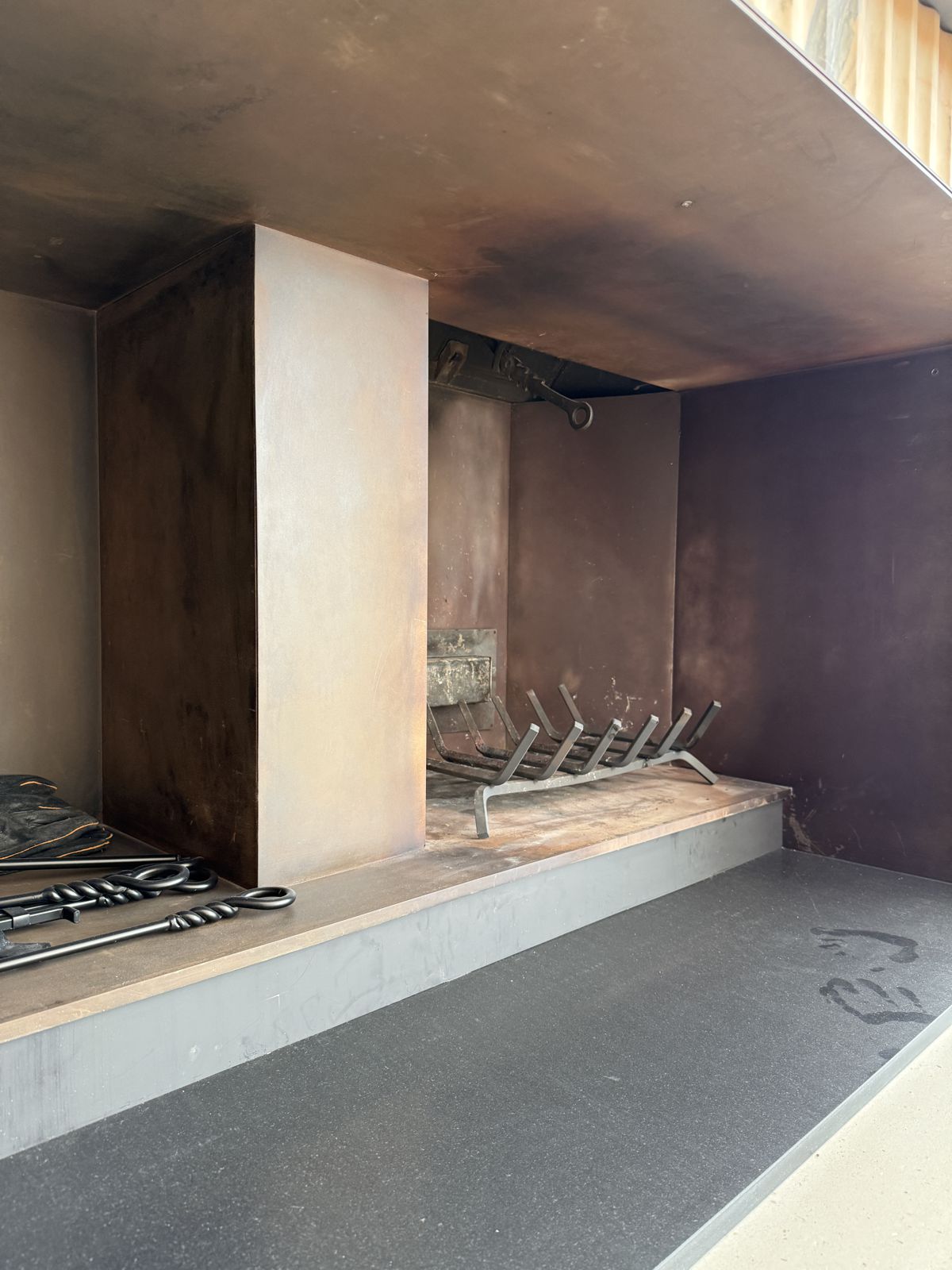 Our Comments: After our phone conversation, we arrived at the free standing screen as the best option. Below are a couple mockups showing the screen with a couple different options for fireplace grates (which we did not discuss), that can be made to fit.