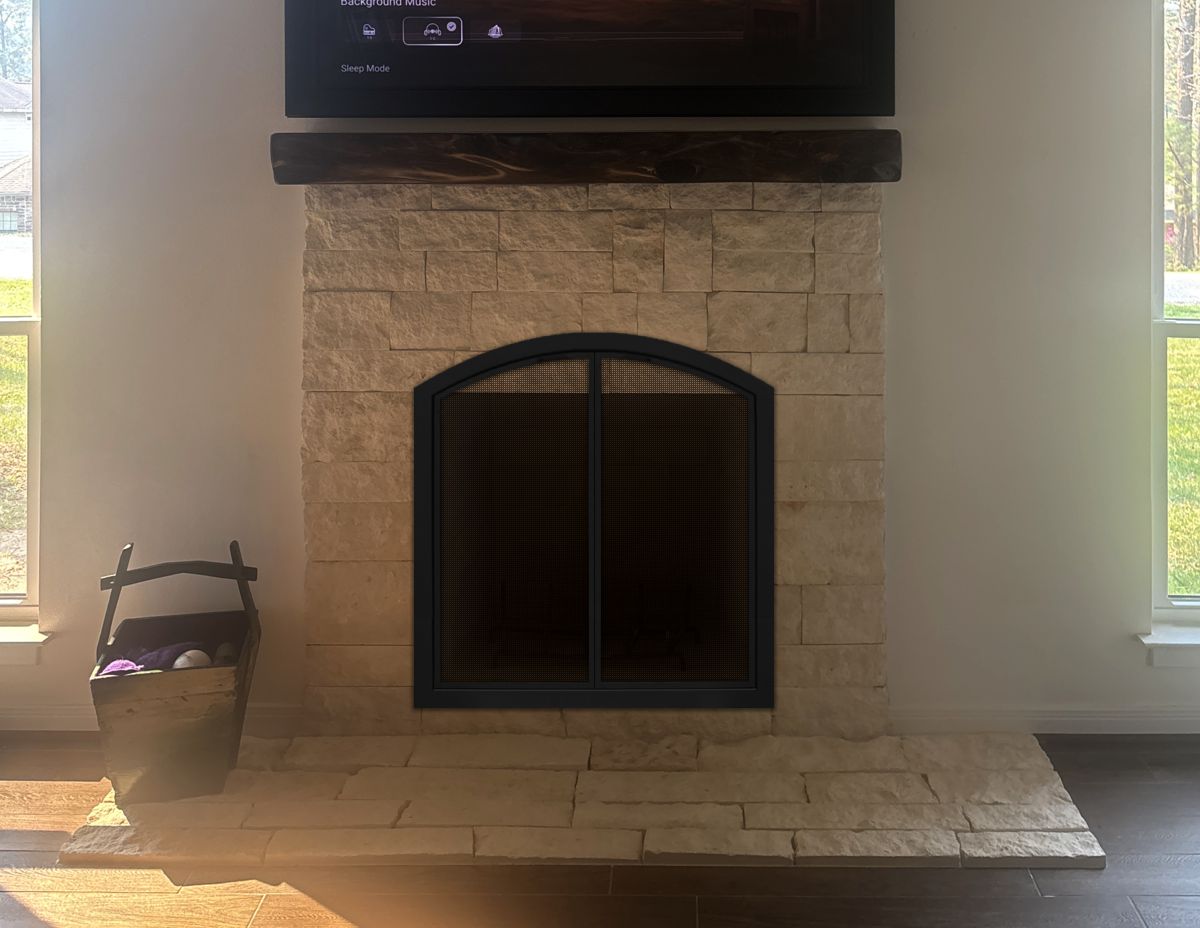 Option #5A: Hearth Creations Outside Fit Mesh Door with 1" Deep Frame in Black. You can see the stones behind the arch in this application.