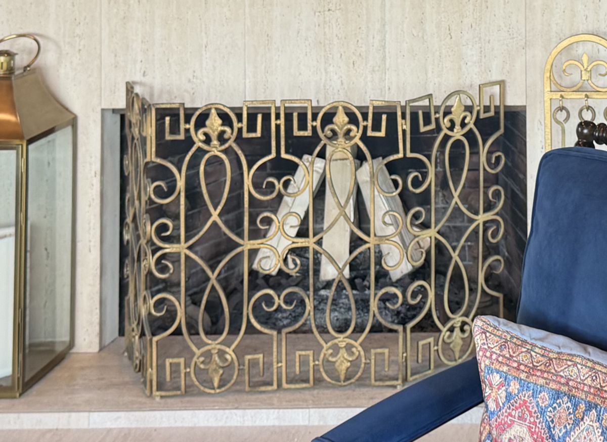 Our Comments: Here are some choices inspired by your decor that I recommend. Free standing screens are normally accompained by andirons, so I am showing them with and without. The andirons I am showing were recently acquired from a buyout that I made and I am selling them at half price.