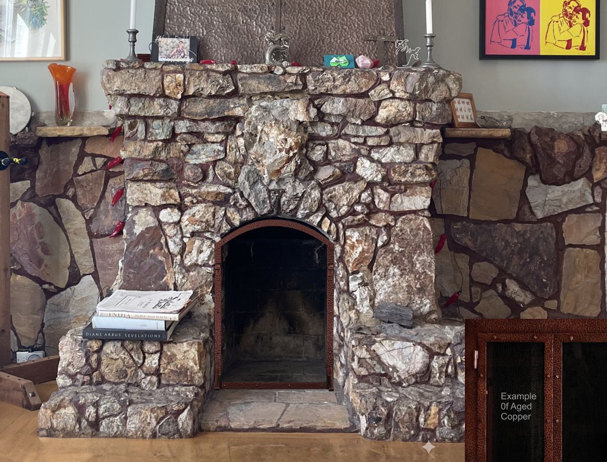 Option #4: Stone Manufacturing Solid Brass Single Panel Arched Fireplace Screen with Hand Hammered Texture in Aged Copper.