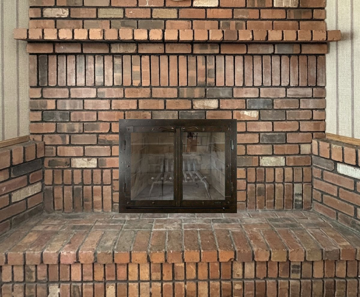 Option #6: Hand Crafted Olde World Wrought Iron Cabinet Fireplace Door in Hammered Medium Bronze with Tempered or Ceramic Glass and Heavy Duty Gate Mesh Backup Doors.