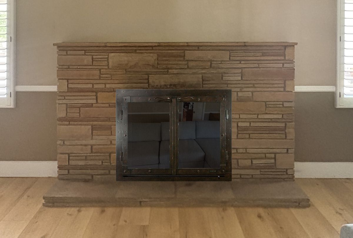 Option #5: Hand Crafted Pacifico Wrought Iron Cabinet Fireplace Door in Burnished Natural Iron with Tempered or Ceramic Glass and Heavy Duty Gate Mesh Backup Doors.