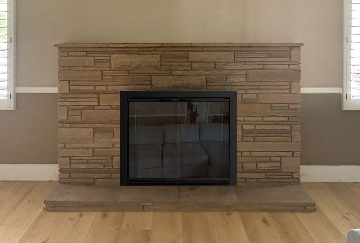 Our Comments: I have created several mockups of doors in black as well as a couple other finishes to consider, although they all can be made black. The main consideration will be whether you want to have the ability to close the glass doors when the fire is burning, in which case you need ceramic glass. I recommend gate mesh backup doors behind the glass, although mesh curtains are an option.