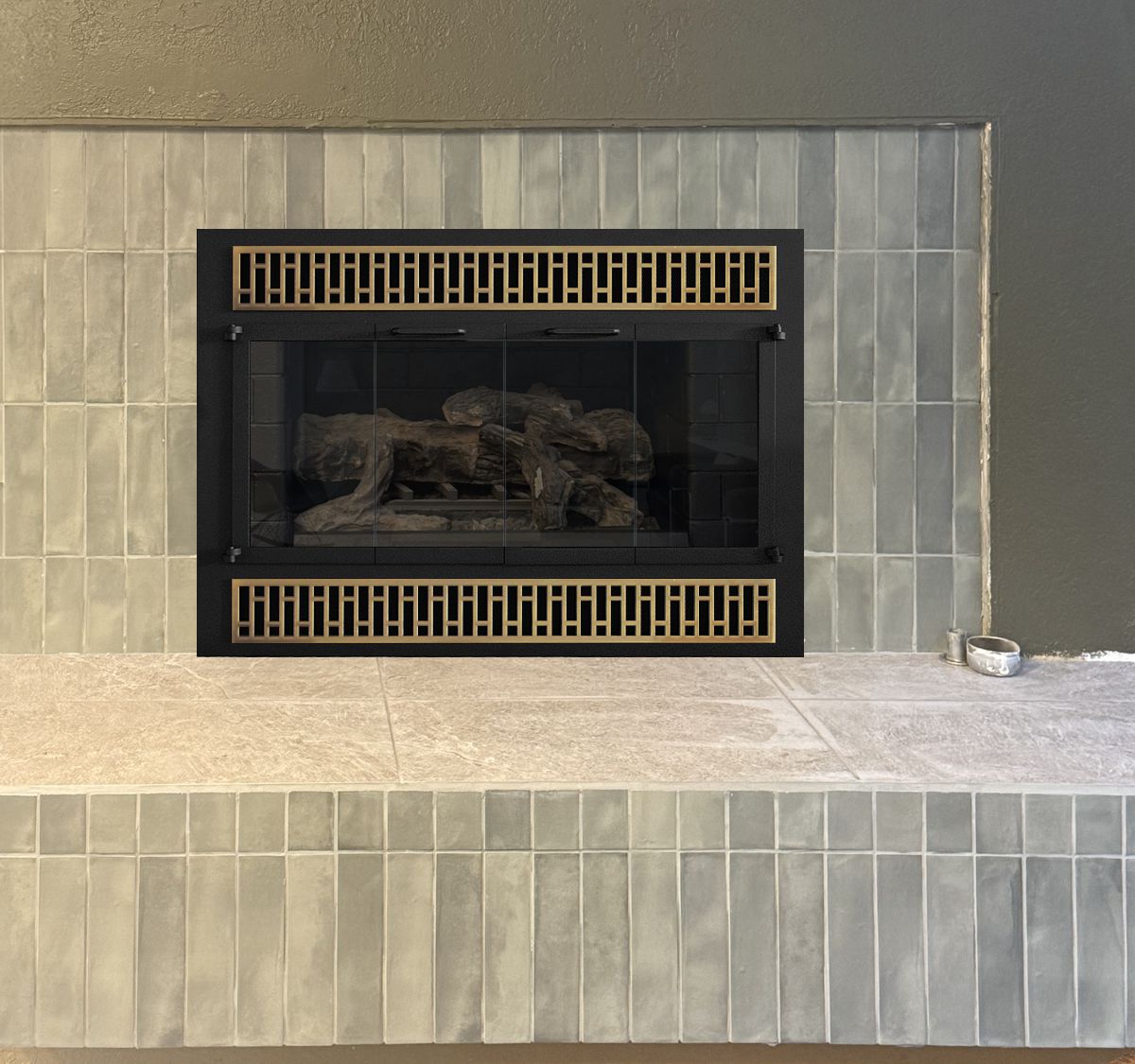 Option #3: Hearth Creations Modern-1 Sleek Steel Fireplace Door with No Visible Handles in Black with Satin Brass Door and Surround Trim and Gray Glass. Includes Gas Log AirWash System for Burning Fires with the Doors Closed.