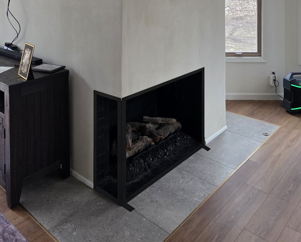 Option #2: Design Specialties Stiletto Aluminum Bifold Corner Fireplace Door in Black with Gate Mesh Backup Doors. Doors must be open when gas is burning.