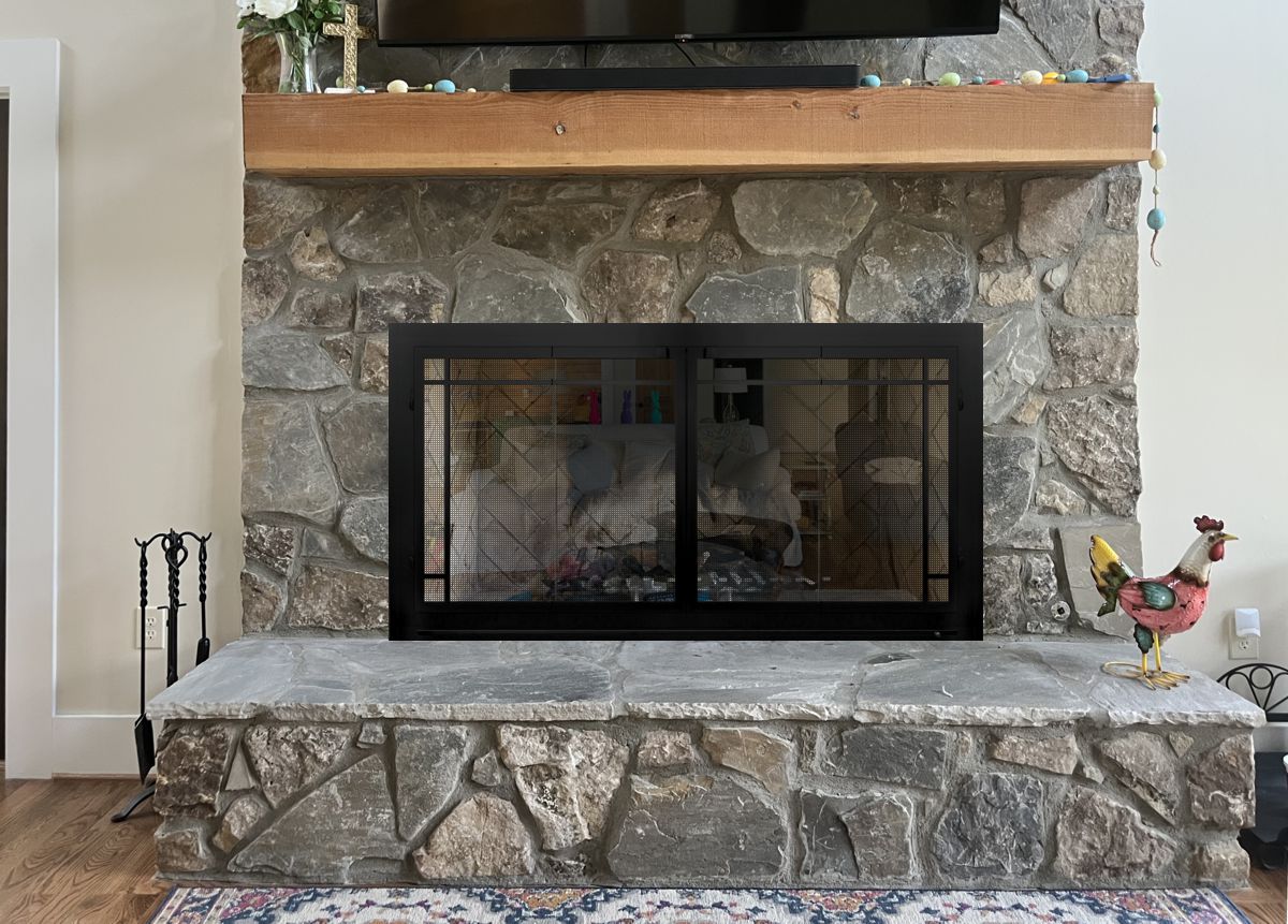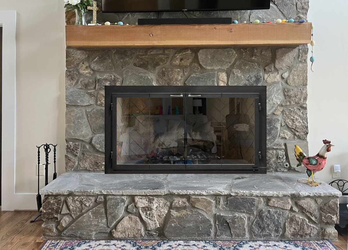 If you are planning on burning anything in your fireplace, you need to have mesh behind the glass so you can burn a fire with the doors open. You can chooe between gate mesh backup doors and sliding mesh curtains. Functionally, gate mesh performs the best as the wire has smaller holes that sparks cannot get through. Aesthetically, mesh curtains may be preferred because they do not have a vertical center frame that obstructs the view of the fire. When you are not using the fire or you want a complete unobstructed view, they do not stick out like gate mesh doors when they are opened.