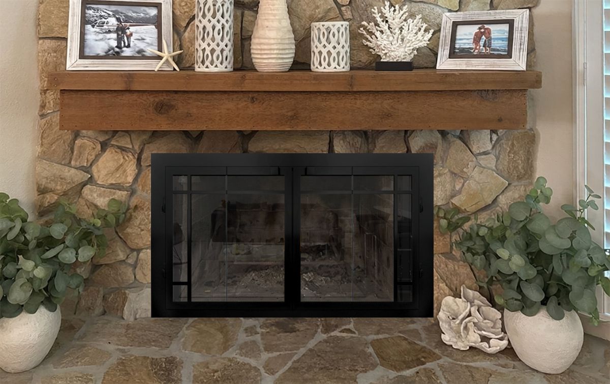 If you are planning on burning anything in your fireplace, you need to have mesh behind the glass so you can burn a fire with the doors open. You can chooe between gate mesh backup doors and sliding mesh curtains. Functionally, gate mesh performs the best as the wire has smaller holes that sparks cannot get through. Aesthetically, mesh curtains may be preferred because they do not have a vertical center frame that obstructs the view of the fire. When you are not using the fire or you want a complete unobstructed view, they do not stick out like gate mesh doors when they are opened.