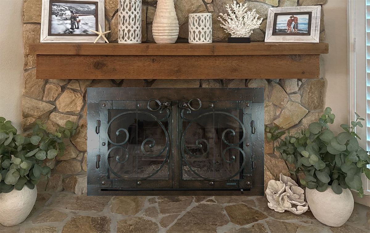 Option #6: Hand Crafted Pacifico Overlap Fit Iron Wrought Bifold Fireplace Door in Burnished Natural Iron with Heavy Duty Gate Mesh Backup Doors.