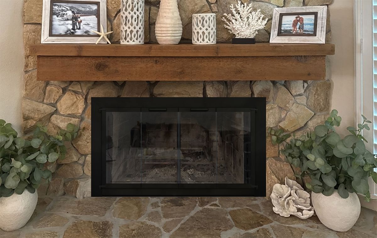 Our Comments: Glass doors for a prefabricated fireplace like yours are not designed to create a tight seal and must be burned with the doors open. If the upper and lower tracks are removeable, the least expensive option will be the aluminum doors made to fit inside the opening. These may or may not work, depending on how the fireplace looks with the tracks removed. The rest of the mockups are doors that overlap the stone and help to hide the prefab fireplace for a more finished look. I recommend using gate mesh backup doors behind the glass instead of mesh curtains as they will be more durable.