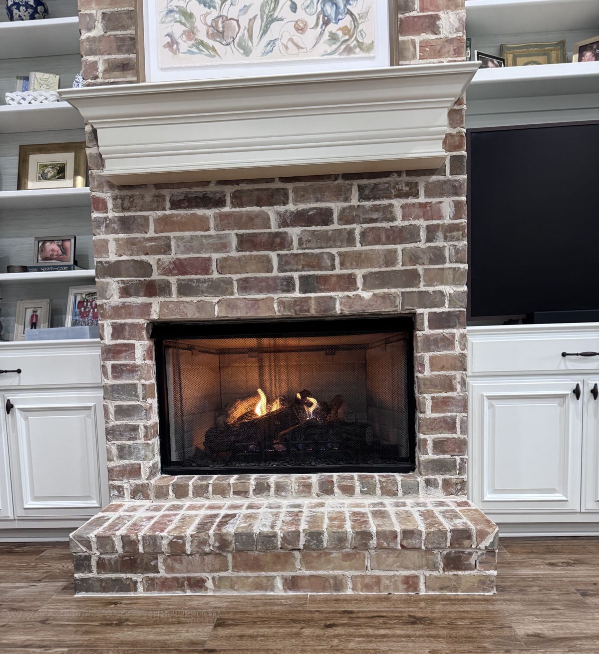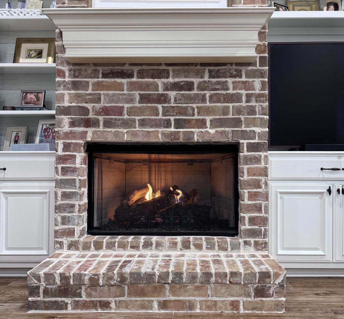 Our Comments: This appears to be a ventless gas fireplace. There is very little room on the brick ledge for a free standing screen. If one is used, it must be attached with magnets, otherwise, the feet may be too small for good stability. I have presented several other options to consider including attached screen doors.