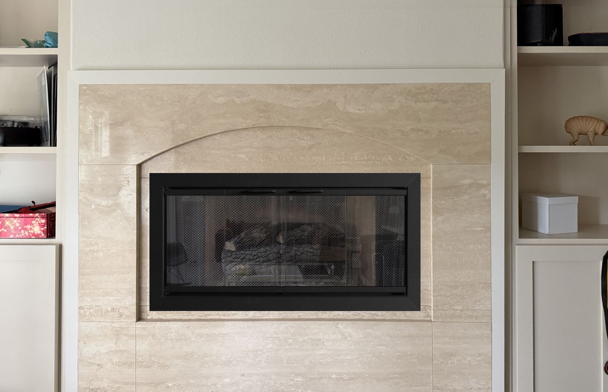 Option #1C (Second Fireplace): PW Creekside Aluminum Bifold Fireplace Door in Matte Black with Tempered Glass (Only). No Bottom Vent with Existing Mesh Curtains.