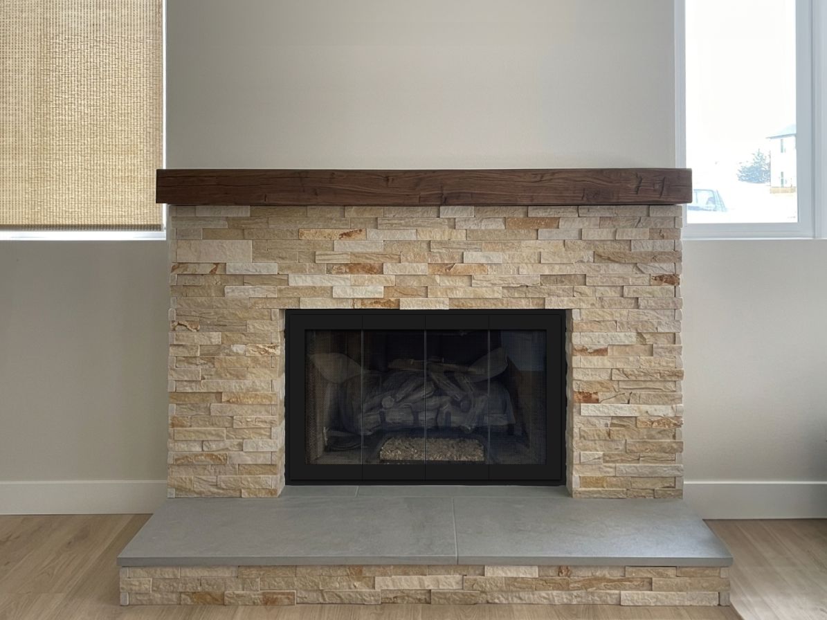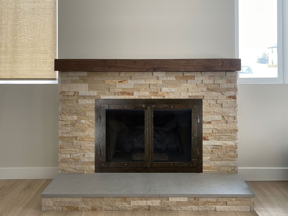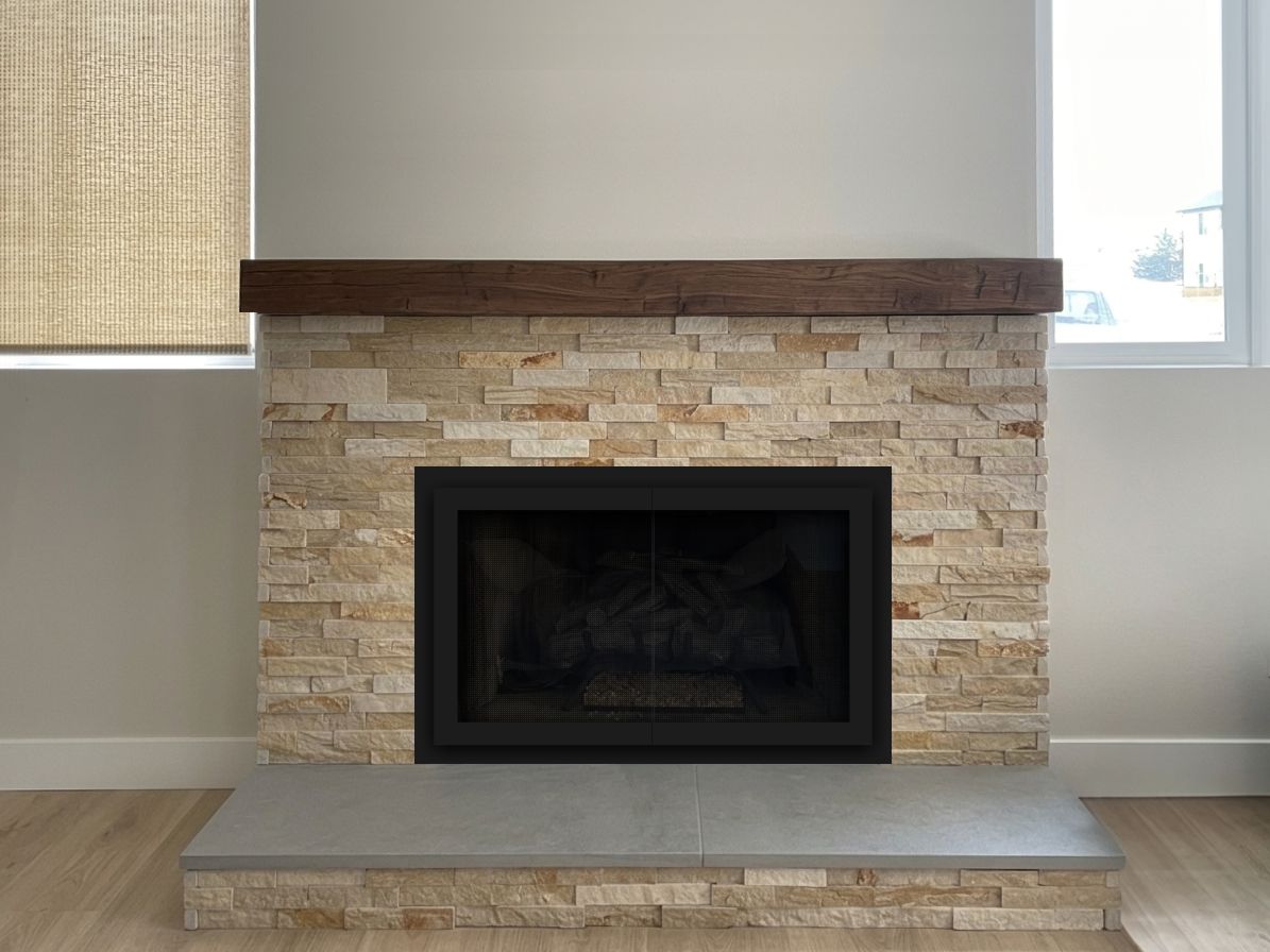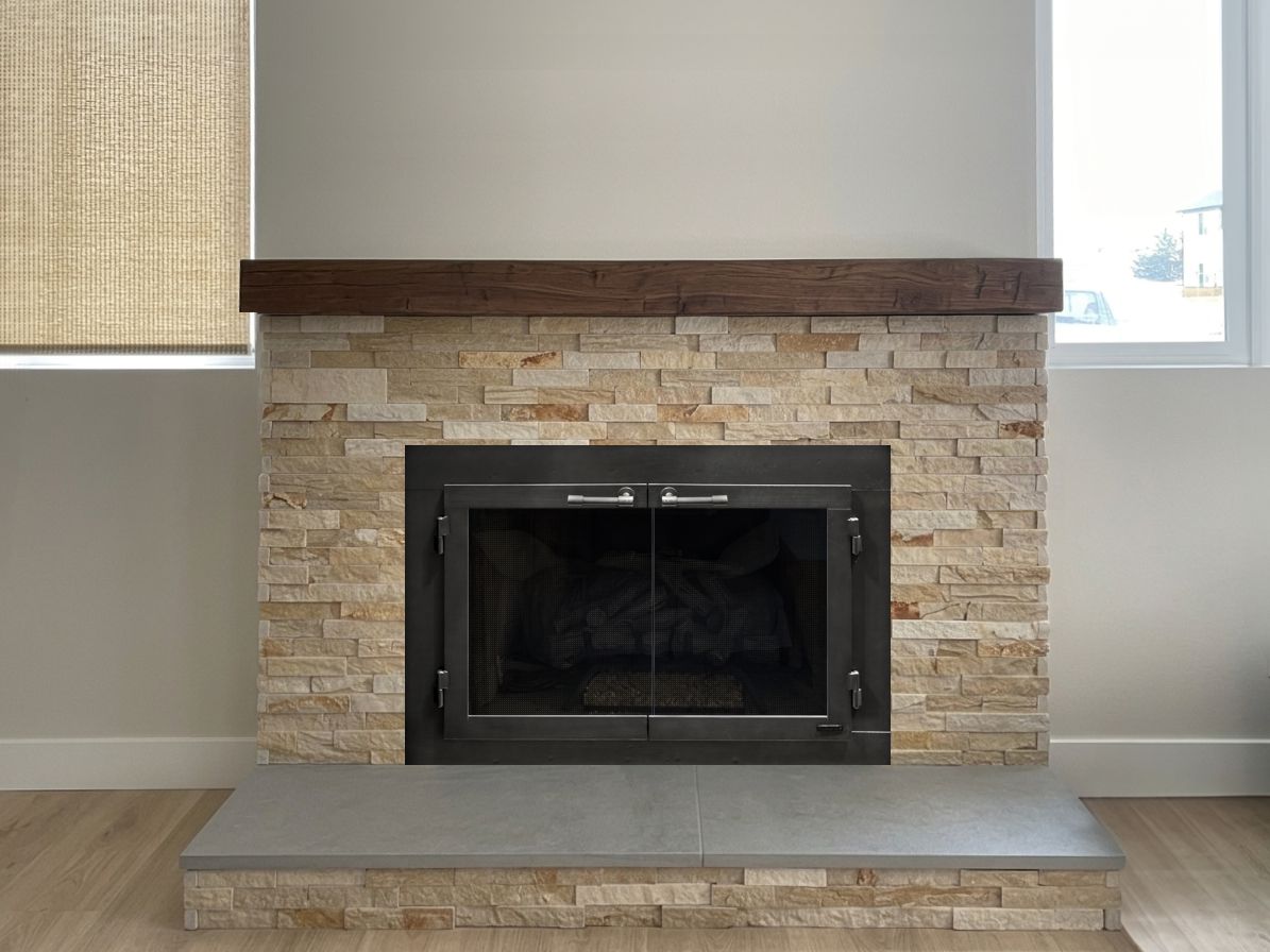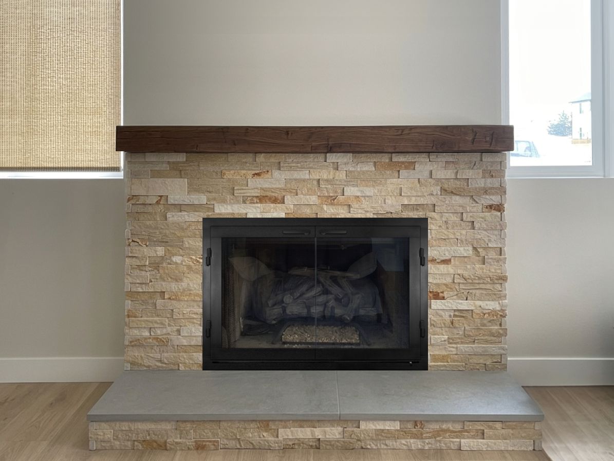 Our Comments: Below are several ways to approach this project. You will need to decide whether to add the doors before or after the stone is done. It can be done either way. The ultimate recommendation I have is the Modern-1 door with the gas log airwash system that allows you to burn fires with the doors closed. You can have that door made to fit inside before the stone is installed or outside overlapping the stone.
